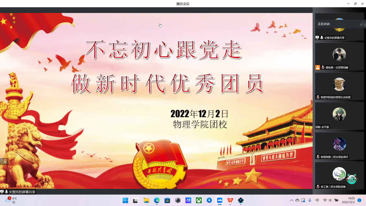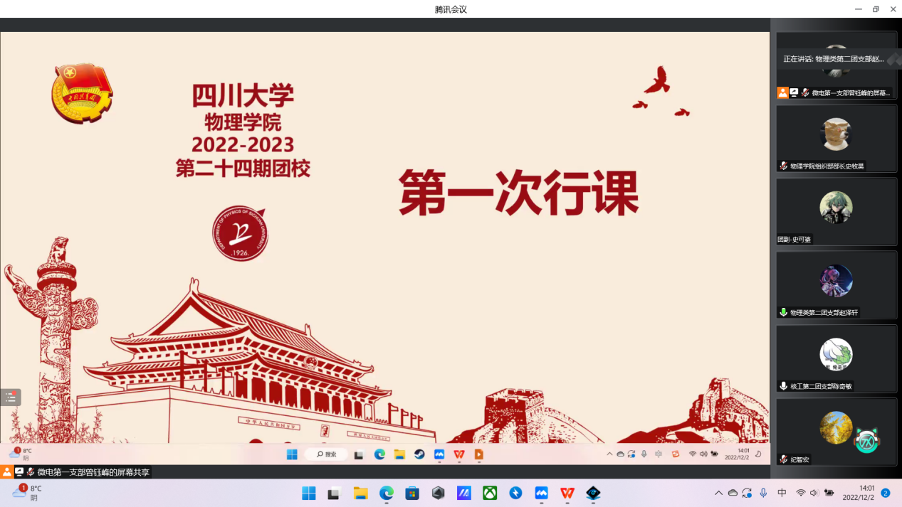 2022年12月2日下午两点,由学院团委组织部主办的团校开学典礼暨第一次行课在线上举行。本次活动的到场嘉宾有学院学生科长兼团委书纪智宏老师、学院团委学生副书记史可鉴、学院团委组织部部长史牧昊、文新学院团委组织部部长徐子恒以及学院团委组织部部长团和各位干事,学院2022级全体团员参加了本次活动。