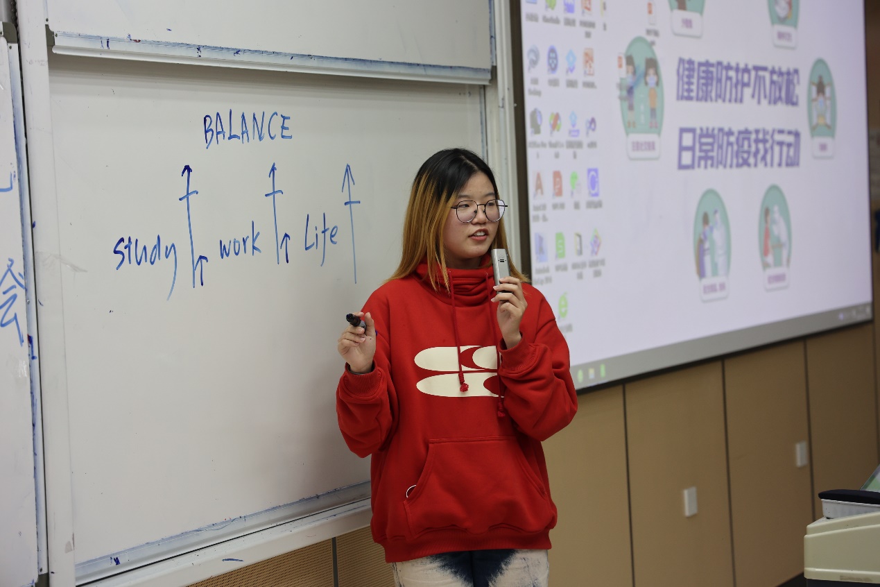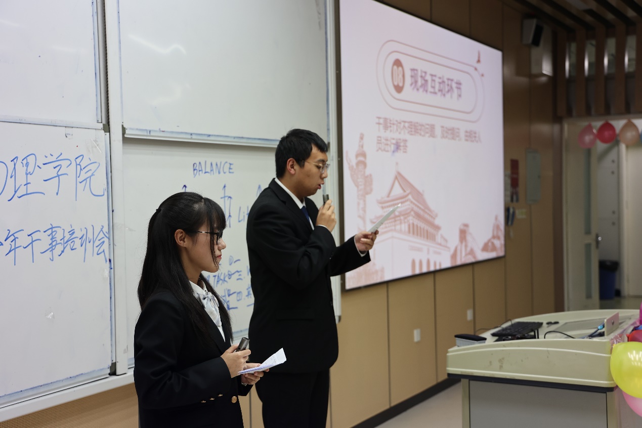 接下来,学生会办公室部长杜政远对干事们进行学生活动经费的报账培训,社团工作部部长陈子豪为大家介绍教室申请和青广申请流程。学院学生会副主席张馨予也就“如何平衡学习、学生工作和生活”与同学们进行了分享和互动。