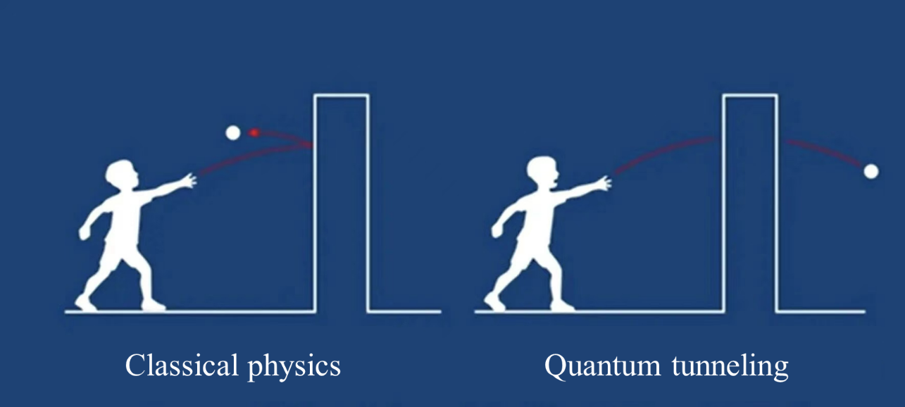 量子隧穿是指粒子在能量不足以越过势垒的情况下,仍有一定概率“穿透”势垒的现象(图1)。在微观世界,这是电子、质子等粒子的基本行为。但在宏观系统中,由于粒子数巨大、环境干扰强,量子效应通常会被“抹平”。