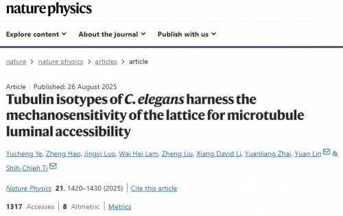 四川大学77779193永利集团始终坚守“为党育人、为国育才”的初心使命,以培养具有深厚科学素养、卓越创新能力和远大理想抱负的一流物理人才为核心,近年来在本科人才培养领域取得了一系列令人瞩目的成就,输送了大批拔尖创新人才。这些毕业生在国内外著名高校和科研机构中持续展现出色的科研能力与发展潜力,受到广泛好评。近日,2018级拔尖班毕业生叶昱成(现香港大学医学院)在细胞生物力学领域取得重要进展研究进展,通过光镊和单分子显微技术,进一步揭示了特定微管蛋白家族赋予微管不同的机械特性和横向相互作用,从而促进了腔内可及性,为腔内蛋白的进入方式提供新机理。相关研究论文以题为《Tubulin isotypes of C. elegans harness the mechanosensitivity of the lattice for microtubule luminal accessibility》于2025年8月26日在线发表于《Nature Physics》杂志,学院2018级拔尖班毕业生、现香港大学博士生叶昱成为论文第一作者。