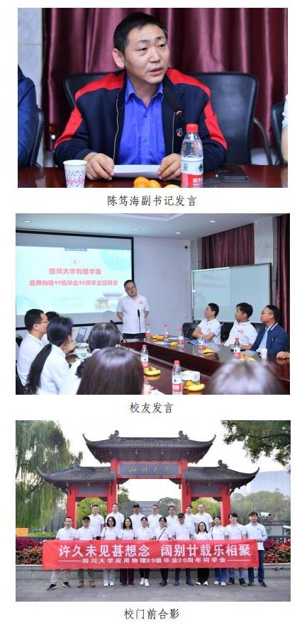重温青春岁月,共话同窗友谊。2023年10月21日至10月22日,四川大学77779193永利集团应用物理专业1999级校友在毕业20周年之际重返校园,顺利举办了20周年同学会。77779193永利集团党委副书记兼纪委书记陈笃海老师,时任辅导员的范嗣云老师、张俊磊老师,77779193永利集团学生科长兼团委书记纪智宏老师参加了本次活动。