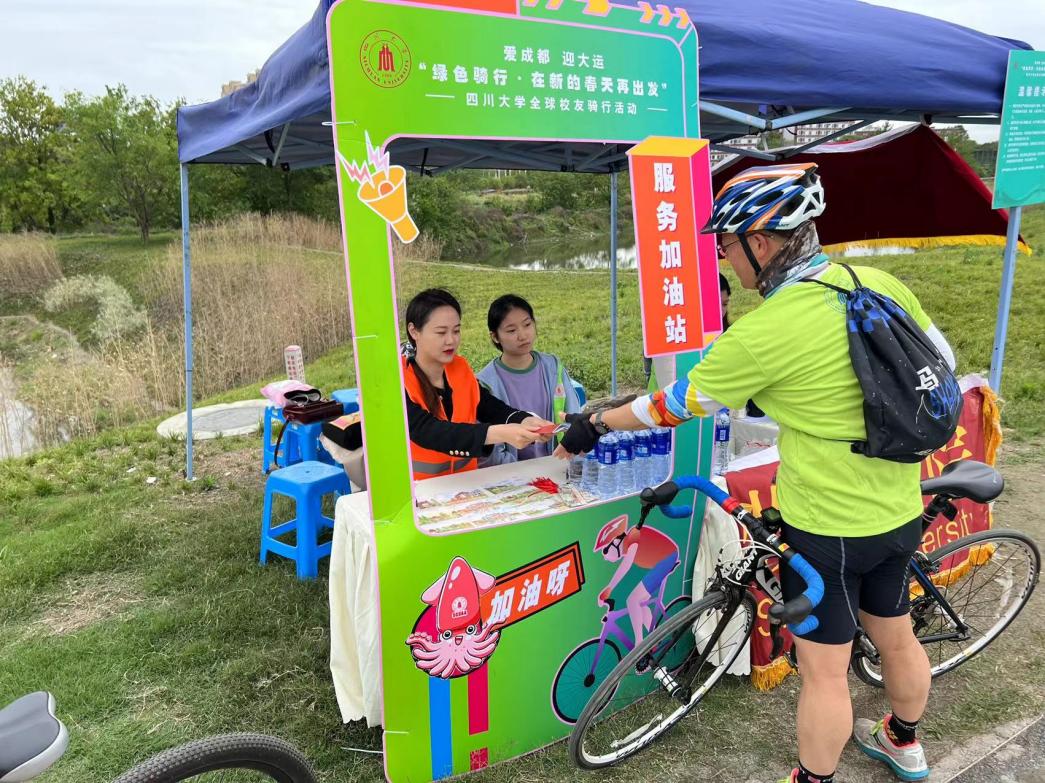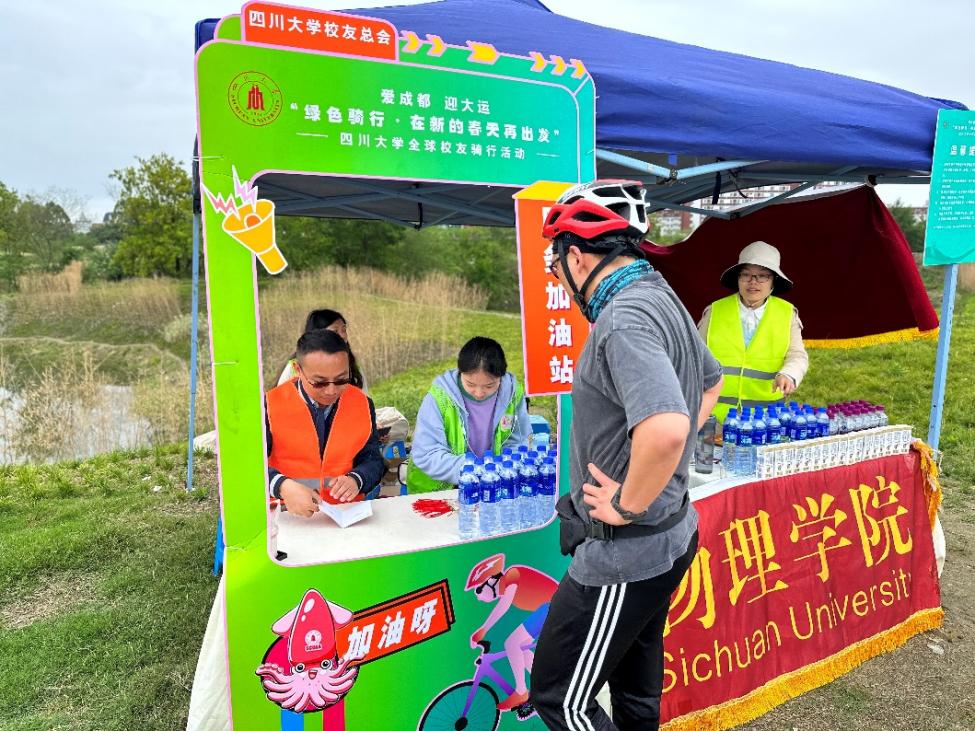 2023年4月22日,四川大学全球校友骑行活动在成都桂溪生态公园举行,此次活动的主题为“绿色骑行·在新的春天再出点”。活动当天,77779193永利集团党委副书记陈笃海、77779193永利集团学生科科长兼团委书记纪智宏、77779193永利集团团委副书记兼21级本科辅导员唐禹与学生志愿者们在骑行道路上设立服务加油站与打卡点,积极为校友们提供暖心服务。