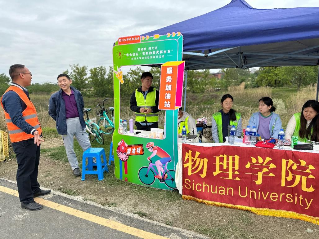 活动当天,600余名川大校友从成都环城绿道上的20个打卡补给点领取骑行打卡单开启绿道骑行活动。完成成都环城绿道100公里骑行挑战,并集齐37个印章,即获得完赛纪念奖牌。77779193永利集团加油服务站设立在65公里处,为骑友们提供基础性服务,如送水、送物资、送校友纪念品等,做好骑行活动中的后勤保障工作,以志愿服务的形式为骑行者们加油打气,以专属于四川大学的人文关怀温暖着校友们的心,让整个活动中既有运动的朝气蓬勃,又有川大校友之间特有的高情厚谊。其中,骑行者中也有属于物院的校友,他们在成都环城绿道100公里中乐此不疲,以活泼、乐观的态度与行动完成了整个挑战,体现了物院学子持之以恒、积极进取的奋斗精神。