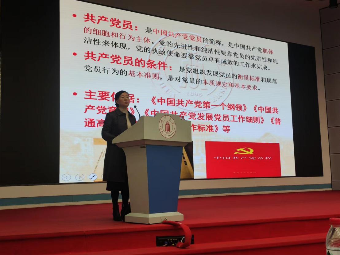 在下午的党校培训中,四川大学党校兼职教师郝清华副教授为学员们讲授了第二场党课。郝老师通过《中国共产党第一个纲领》、《中国共产党章程》、《中国共产党发展党员工作细则》等文件讲解了成为一名中共党员需要具备的条件以及共产党员这一身份的重要内涵与意义,并通过对不同时期入党宣誓内容的变化过程回顾一名合格的共产党员需要遵守的各项规定和纪律。最后,郝老师希望各位学员在成为一名光荣的中国共产党员后能够做到严格遵守党的规定,认真履行党员义务,发挥党员的先锋模范作用。