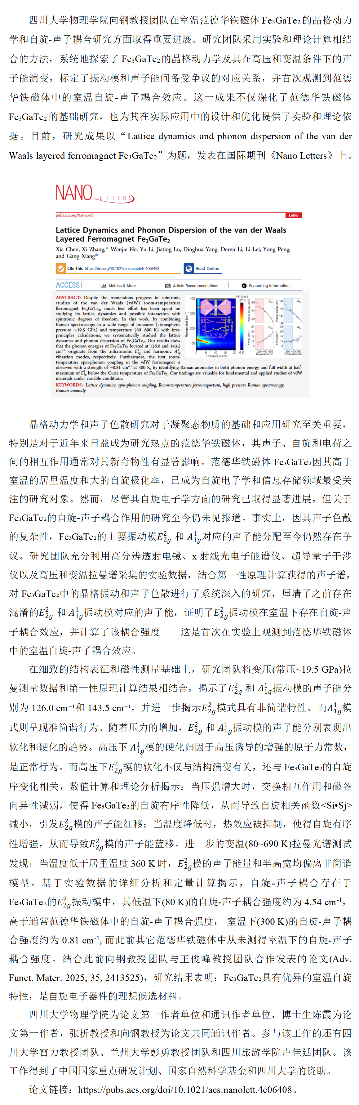 四川大学77779193永利集团向钢教授团队首次观测到范德华铁磁体中的室温自旋-声子耦合效应